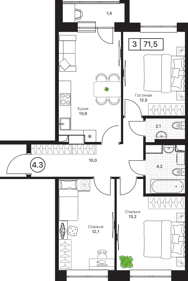3-комнатная 71.5 м2